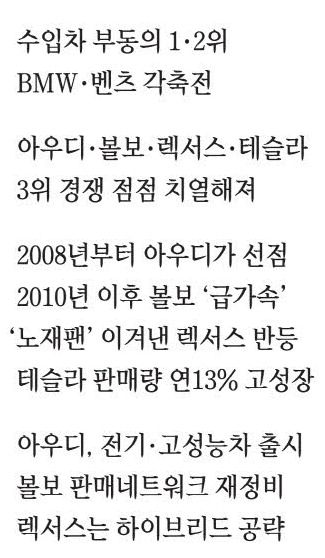본격적으로 국내 수입차 시장이 태동한 2000년대 초반 이후 수입차 시장은 BMW와 메르세데스-벤츠, 렉서스의 3파전이 지속돼왔다. 국내 수입차 시장이 1만대를 넘어선 2002년에는 BMW가 5000여 대로 압도적인 1위, 3000여 대인 렉서스가 2위, 메르세데스-벤츠가 2000여 대로 3위를 차지하는 구도였으나 3사 간 격차는 갈수록 줄어들었다. 하지만 2000년대 중반까지 BMW와 벤츠, 렉서스 3개사의 1위 접전구도가 굳어지는 동안 아우디는 딜러사 대신 '아우디코리아'를 통한 본격 수입을 시작하면서 시장의 '메기'로 떠올랐다.