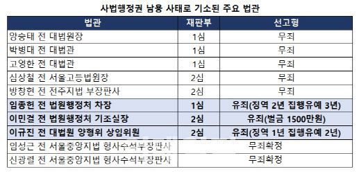 하급심에서 일부 유죄가 선고된 것은 임 전 차장을 비롯해 이민걸 전 법원행정처 기조실장과 이규진 전 대법원 양형위 상임위원이다. 이민걸 전 실장과 이규진 전 상임위원은 항소심에서 각각 벌금 1500만원과 징역 1년에 집행유예 2년을 선고받았고, 현재 대법원 판단을 기다리고 있다.