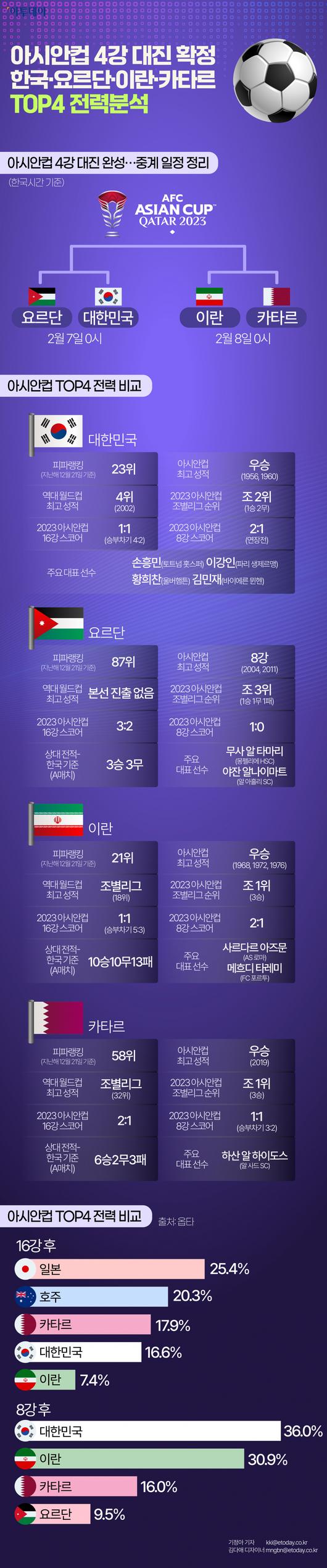 아시안컵 4강 대진 확정…한국·요르단·이란·카타르, TOP4 전력분석 [인포그래픽]