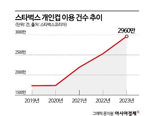 스타벅스는 그동안 친환경 소비문화 정착을 위한 다양한 정책을 시행해왔다. 개인 컵 음료 할인 혜택이 대표적이다. 스타벅스는 1999년 국내 진출 당시부터 개인 컵을 이용하는 고객에게 300원 할인 혜택을 제공했고, 2022년부터 할인 혜택을 400원으로 강화했다. 실제 유인정책은 효과를 보고 있는데, 2019년 1732만건 수준이던 개인 컵 이용 건수는 코로나19 팬데믹을 거치며 2021년 2190만 건으로 늘어났다. 엔데믹 전환 이후에도 개인 컵 이용자들은 계속해서 늘어나 지난해에는 전년(2530만 건) 대비 약 17% 증가한 2960만 건을 기록했다.