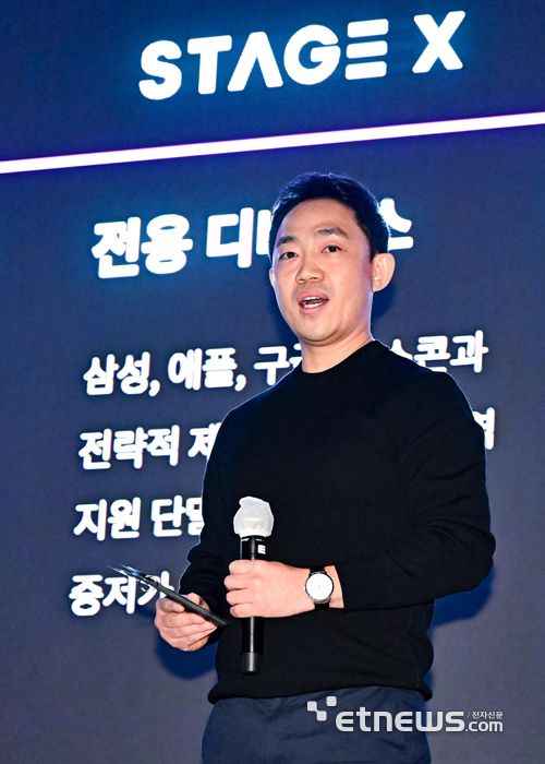 5세대(5G) 이동통신 28㎓ 주파수 경매 에서 승리한 스테이지엑스 미디어데이가 7일 서울 여의도 페어몬트 앰배서더 호텔에서 열렸다. 서상원 대표가 28㎓ 통신 사업전략을 발표하고 있다.