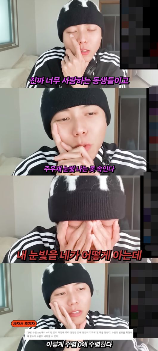 이어 "그런데 여러분들이 생각하는 그런 글들이 자주 올라오더라. 얼마 전에 '주우재 눈빛 나는 못 속인다', '얼마 안있다가 연애설 터질 듯'. 내 눈빛을 어떻게 아냐"라며 눈을 감았다.