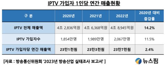 반면 기존 IPTV의 '가입자 1인당 연간 매출액'은 2020년의 23만1천원에서 2년뒤인 2022년에는 23만7천원으로 고작 2.4% 증가하는 데 그쳤다. IPTV의 수익성 지표는 뚜렷이 악화되고 있다는 뜻이다.