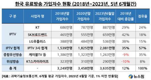 둘째, 전체 유료방송 가입자수는 여전히 증가 추세다. 한국의 유료방송 전체 가입자수는 2018년에 3,249만명에서 2023년 6월말에는 386만명이 증가한 3,635만명이다. 5년 6개월간 12%가 증가했다. 증가율이 낮긴 하지만 계속 성장중이다.