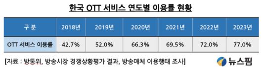 그렇다면 한국의 OTT 서비스 이용률은 얼마나 늘었을까? 2023년 기준 OTT 서비스 이용률은 무려 77%까지 올라왔다. 2018년의 42.7%와 비교하면 성장폭이 엄청나다. 이제 한국 국민 10명 중 8명은 OTT 서비스를 이용한다고 보면 된다. 외견상 한국 OTT 시장은 급성장 중이다.