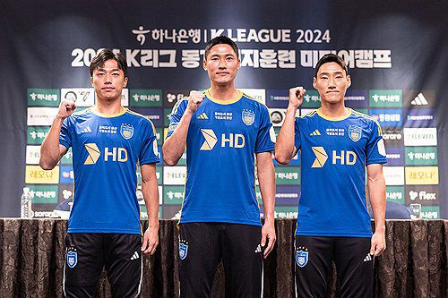 (서울=연합뉴스) 프로축구 K리그1 울산 HD(옛 울산 현대)에 새로 합류한 고승범(왼쪽부터), 황석호, 심상민이 7일 울산시 동구 호텔현대 바이 라한 울산에서 열린 2024 K리그 동계 전지훈련 미디어캠프 기자회견에서 포즈를 취하고 있다. 2024.2.7 [한국프로축구연맹 제공. 재판매 및 DB 금지]