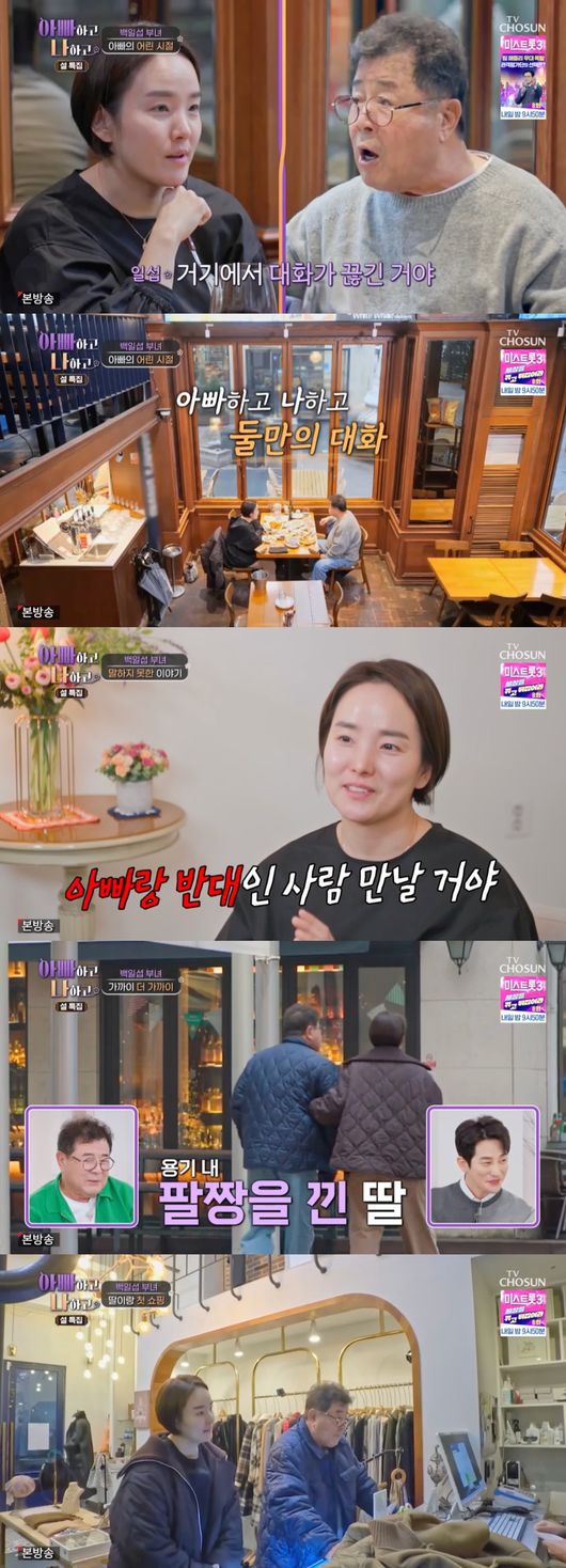 백일섭과 딸은 어색함에 침묵을 지켰다. 이에 사위가 나서서 딸과의 연애 스토리를 설명하며 분위기를 풀었다. 이후 세 사람은 결혼식 등 지난 추억을 되새기며 이야기를 나눴다.