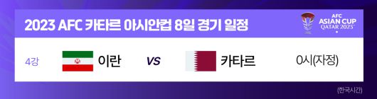 2023 아시아축구연맹(AFC) 카타르 아시안컵 8일 경기 일정4강- 이란 vs 카타르 0시(자정) [이투데이/김다애 기자 (mngbn@etoday.co.kr)] ▶프리미엄 경제신문 이투데이 ▶비즈엔터이투데이(www.etoday.co.kr), 무단전재 및 수집, 재배포금지