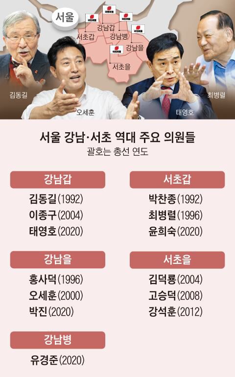 교육열이 높은 지역 특수성을 겨냥해 전문가 그룹의 맞춤 공천도 자주 있었다. 외교관 출신 심윤조(강남갑·2012)·김종훈(강남을·2012), 경제학자 출신 이혜훈(서초갑·2004)·윤희숙(서초갑·2020)·강석훈(서초을·2012), 변호사 출신 고승덕(서초을·2008), 통계청장 출신 유경준(강남병·2020) 의원 등이다. 박성민 정치컨설턴트는 “강남·서초는 90년대까지만 해도 거물급 정치인이 주로 공천을 받는 보수 정당의 ‘정치 1번지’였다”며 “국민의힘 입장에서는 누가 봐도 훌륭한 분들을 모셔와 대우를 좀 해줄 필요가 있는 곳”이라고 했다. 김동길 전 자민련 고문, 최병렬 전 한나라당 대표, 박찬종 전 한나라당 고문, 김덕룡 전 한나라당 원내대표 등이 모두 강남·서초에서 의원을 지냈다.