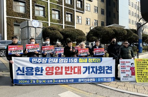 이재명 민주당 대표 지지 당원들의 모임으로 알려진 충북민주연합과 잼사모는 8일 충북도청 서문 앞에서 기자회견을 열어 "신 전 교수는 민주당의 정체성에 반하는 삶의 궤적을 가진 인물"이라며 "당 지도부는 영입을 철회하라"고 촉구했다.