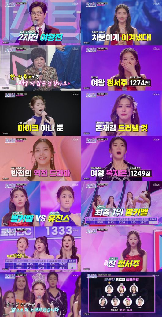 지난 2일부터 8일까지 진행된 5주차 투표 집계 결과 ‘감성 천재’ 빈예서가 막강한 경쟁자들을 제치고 4주 연속 1위를 차지했다. ‘꺾기 인간 문화재’ 배아현, ‘첫눈 보이스’ 정서주, ‘명품 끼 패키지’ 김소연, ‘러블리 트로트퀸’ 오유진, ‘해남 처녀 농부’ 미스김, ‘정통 트로트 강자’ 나영이 톱7에 올랐다.