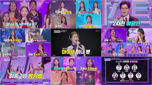지난 2일부터 8일까지 진행된 5주차 투표 집계 결과 ‘감성 천재’ 빈예서가 막강한 경쟁자들을 제치고 4주 연속 1위를 차지했다. ‘꺾기 인간 문화재’ 배아현, ‘첫눈 보이스’ 정서주, ‘명품 끼 패키지’ 김소연, ‘러블리 트로트퀸’ 오유진, ‘해남 처녀 농부’ 미스김, ‘정통 트로트 강자’ 나영이 TOP7에 올랐다.