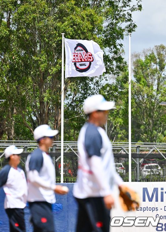 [OSEN=시드니(호주), 박준형 기자] 두산 베어스가 10일 호주 시드니 블랙타운 베이스볼 스타디움에서 2024 호주 시드니 스프링캠프를 진행했다. 시드니 블랙타운 베이스볼 스타디움에 펄럭이는 두산 베어스 깃발. 2024.02.10 / soul1014@osen.co.kr