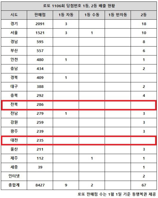 동행복권이 10일 추첨한 로또 1106회 당첨번호 조회 결과 1등은 11명, 2등은 67게임이다. 전국 17개 시도 중 전북, 대전 지역에서는 로또 고액(1,2등) 당첨 판매점이 단 한 곳도 나오지 않았다. |