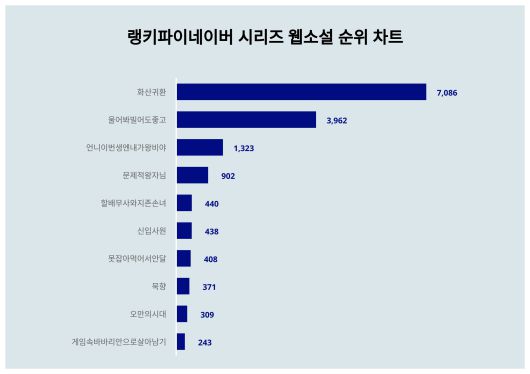 순위 키워드 1월 5주차 1월 4주차 증감 비율 1 화산귀환 7,086 7,369 -283 -3.8% 2 울어봐빌어도좋고 3,962 3,173 789 24.9% 3 언니이번생엔내가왕비야 1,323 1,546 -223 -14.4% 4 문제적왕자님 902 885 17 1.9% 5 할배무사와지존손녀 440 388 52 13.4% 6 신입사원 438 772 -334 -43.3% 7 못잡아먹어서안달 408 580 -172 -29.7% 8 묵향 371 388 -17 -4.4% 9 오만의시대 309 292 17 5.8% 10 게임속바바리안으로살아남기 243 236 7 3.0% [출처: 랭키파이 문화/엔터테인먼트 네이버 시리즈 웹소설 트렌드 테이블]
