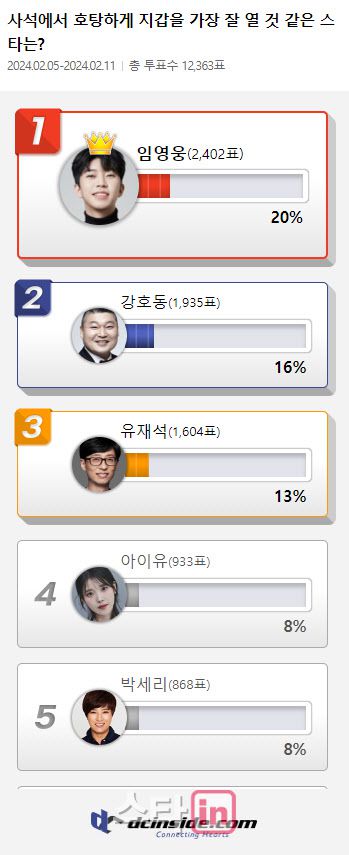 커뮤니티 포털사이트 디시인사이드(대표 김유식)가 ‘사석에서 호탕하게 지갑을 가장 잘 열 것 같은 스타는?’으로 투표를 한 결과 임영웅이 1위에 올랐다고 12일 밝혔다. 이 투표는 지난 5일부터 11일까지 총 7일간 진행했다.