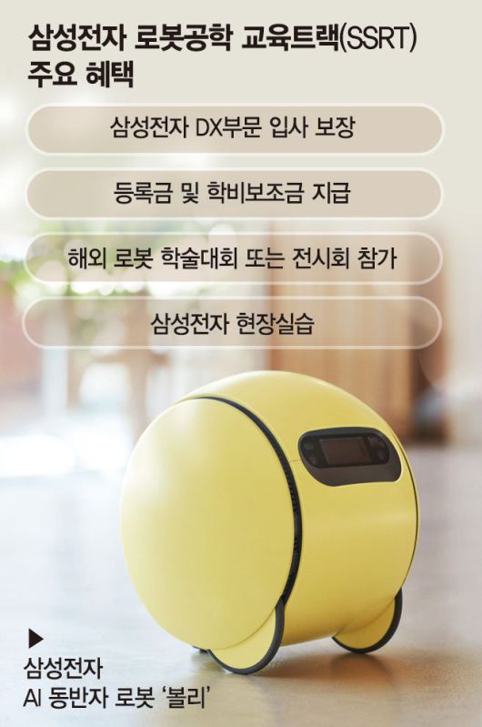 삼성전자는 서류 접수, 삼성직무적성검사(GSAT) 또는 소프트웨어(SW) 역량테스트, 면접 등을 거쳐 합격자를 최종 선발한다. 합격자는 산학장학생 프로그램을 통해 등록금, 학비보조금 등을 지원받는다. 해외 로봇 학술대회나 전시회 참관도 가능하다. 방학 중 삼성전자 현장실습 기회도 제공받는다. 석사 학위를 취득할 경우 추가 전형 없이 삼성리서치, 생산기술연구소, 로봇사업팀 등 삼성전자 디바이스경험(DX) 부문 입사가 보장된다. 지난해 삼성전자는 로봇산업 우수 인력을 키우기 위해 한국과학기술원(KAIST)에 이어 서울대에도 트랙을 개설했다.