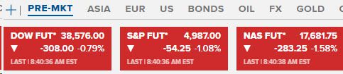 13일(현지시간) 오전 8시47분 기준 뉴욕증권거래소에서 다우지수 선물은 전 거래일 대비 0.8%, S&P500 선물은 1.09%, 나스닥지수 선물은 1.59% 빠지고 있다. 정규장은 9시30분부터 시작이다.