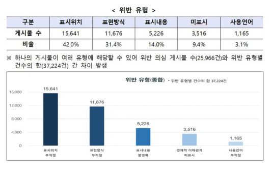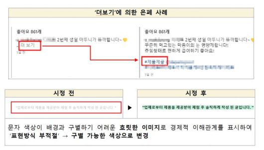 가령 '광고'나 '협찬'이란 문구를 소비자가 쉽게 알아볼 수 있는 첫 화면에 표시하지 않고 '더보기'를 클릭해야 확인할 수 있는 위치에 적거나 댓글 등에 표시한 사례가 많았다. 소비자가 쉽게 인식할 수 없는 작은 글자나 흐릿한 이미지로 적는 경우도 나타났다.