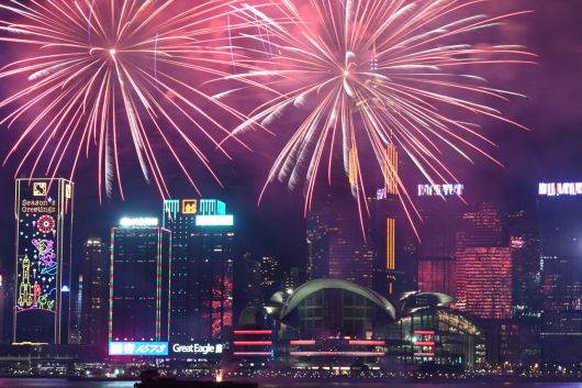 지난 11일 홍콩에서 빅토리아 항구 위에 펼쳐지고 있는 불꽃놀이 풍경. [AFP] |