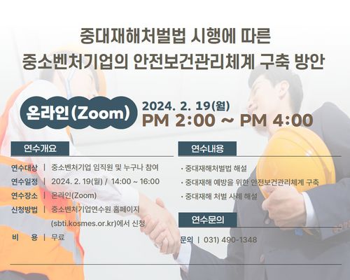산업안전보건 전문가가 강사로 나서 법률 적용 범위, 처벌 내용, 사업주 의무 등을 설명하고 중소벤처기업 사업장의 안전보건 관리체계 구축방안과 중대재해 적용 사례를 공유할 예정이다.