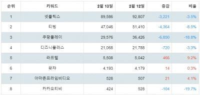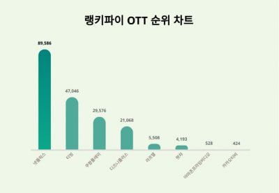 티빙은 89,586포인트로 전일보다 3,221포인트 하락해 2위를 차지했다. 쿠팡플레이, 디즈니플러스, 라프텔, 왓챠, 아마존프라임비디오, 카카오티비가 뒤를 이으며 3~8위를 기록했다.