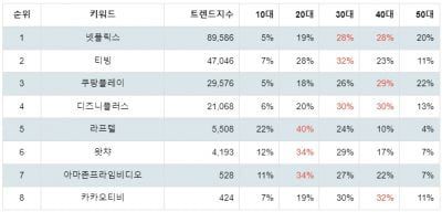 트렌드 지수 1위 넷플릭스의 빅데이터 조사한 결과, 넷플릭스 요금제, 넷플릭스 영화 추천, 넷플릭스 공유, 넷플릭스 드라마 추천, 넷플릭스 추천 등이 주목받는 관련 검색어로 나타났으며 2위 티빙은 티빙 요금제, 티빙 한 달 무료, 티빙 웨이브, 티빙 드라마, 티빙 추천, 3위 쿠팡플레이는 쿠팡플레이 TV 연결, 쿠팡플레이 가격, 쿠팡플레이 추천, 쿠팡플레이 드라마, 쿠팡플레이 해지 등으로 나타났다.