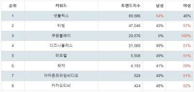 14일 랭키파이에 따르면 넷플릭스는 트렌드 지수 89,586포인트로 전일보다 3,221포인트 하락해 1위에 올랐다.