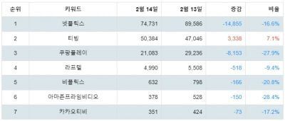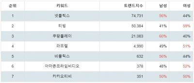 트렌드 지수 1위 넷플릭스의 빅데이터 조사한 결과, 넷플릭스 요금제, 넷플릭스 영화 추천, 넷플릭스 공유, 넷플릭스 드라마 추천, 넷플릭스 추천 등이 주목받는 관련 검색어로 나타났으며 2위 티빙은 티빙 요금제, 티빙 한달무료, 티빙 웨이브, 티빙 드라마, 티빙 추천, 3위 쿠팡플레이는 쿠팡플레이 tv연결, 쿠팡플레이 가격, 쿠팡플레이 추천, 쿠팡플레이 드라마, 쿠팡플레이 해지 등으로 나타났다.