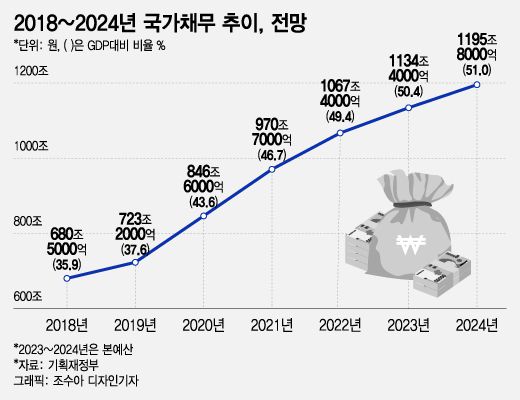 지방정부 채무까지 더한 국가채무는 지난해 본예산 기준 1134조4000억원에서 올해 1195조8000억원으로 늘어날 전망이다. GDP 대비 국가채무비율은 같은 기간 50.4%에서 51.0%로 오른다. 나랏빚이 경제 규모의 절반을 넘는 것이다.