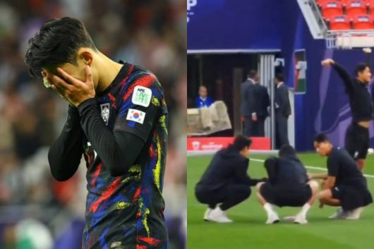 (왼쪽) 2023 AFC 아시안컵 요르단전 참패 후 슬퍼하는 손흥민. 손가락에는 부상으로 인해 붕대가 감겨 있다. (오른쪽) 요르단전에 앞서 경기장에서 물병 던지기 놀이를 하는 이강인 설영우 정우영 /사진=뉴시스, X(엑스, 구 트위터) 캡처 |