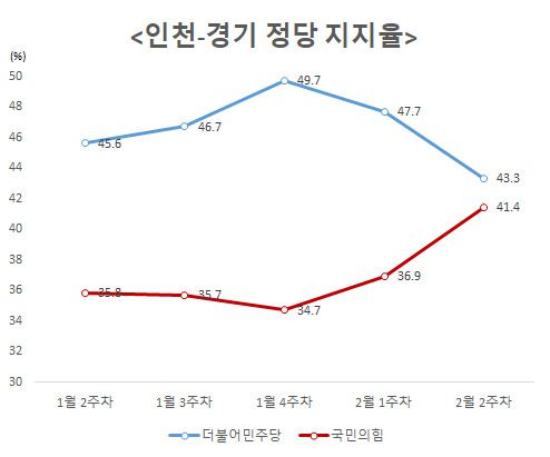 1월 3주 차 조사에선 35.7%, 46.7%로 11%포인트(P) 차이가 벌어졌고, 1월 4주 차 조사에선 15%P 차이나 벌어진 34.7%, 49.7%로 각각 집계됐다. 2월 1주 차 조사에서 36.9%, 47.7%로 좁아진 양당의 지지도 차이는 2월 2주차 조사에서 41.4%, 43.3%로 나타나며 오차범위 내로 줄어들었다.