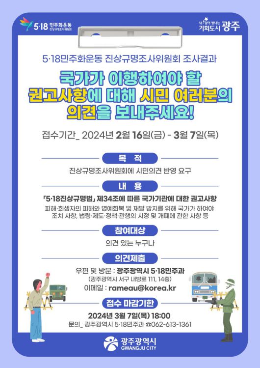 시민 의견접수는 오는 3월 7일까지 진행되며, 국가에 대한 권고사항 관련 의견이 있는 시민은 시청을 방문하거나 등기우편(광주광역시 서구 내방로 111, 5·18민주과(치평동)), 이메일로 제출하면 된다.
