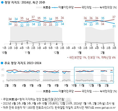 16일 발표된 한국갤럽 2월 3주차(13~15일) 여론조사 결과를 보면 정당 지지도에서 국민의힘은 37%, 민주당은 31%를 기록했다. 국민의힘은 직전 조사(2월 1주차)보다 3%포인트 올랐고, 민주당은 4%포인트 떨어졌다. 양당 지지율 차이는 6%포인트다. 한국갤럽은 “양당 격차는 통계적으로 우열을 가릴 수 없는 오차범위(최대 6%포인트) 내에서의 변동”이라고 분석했지만 지난해 9월 이래 한국갤럽 정당 지지도 추이 중 가장 격차가 크다.