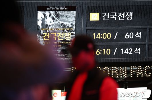 (서울=뉴스1) 이승배 기자 = 이승만 전 대통령의 생애와 정치적 행보를 다룬 다큐멘터리 영화 '건국전쟁'이 60만 관객을 돌파했다. 18일 영화진흥위원회 영화관입장권 통합전산망 집계에 따르면 다큐멘터리 영화 '건국전쟁'은 지난 17일 토요일 9만1172명이 관람해 박스오피스 2위에 올랐으며, 누적 관객수는 62만6765명을 기록하고 있다. 이는 지난 16일 50만 관객을 동원한지 하루만의 기록으로, 다큐 영화가 60만 관객을 돌파한 것은 지난 2017년 ‘노무현입니다’ 이후 7년 만에 처음이다. 18일 서울 시내의 한 영화관에 건국전쟁 상영안내가 표시되고 있다. 2024.2.18/뉴스1