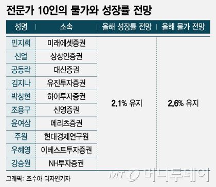 물가전망치 역시 한은이 이번 경제전망에서 눈높이를 바꿀 가능성은 낮다는 게 전문가들의 대체적 견해다. 한은은 지난 전망에서 올해 물가상승률 전망치로 2.6%를 제시했는데 전문가 10명 모두 이 전망치를 유지할 것으로 내다봤다.