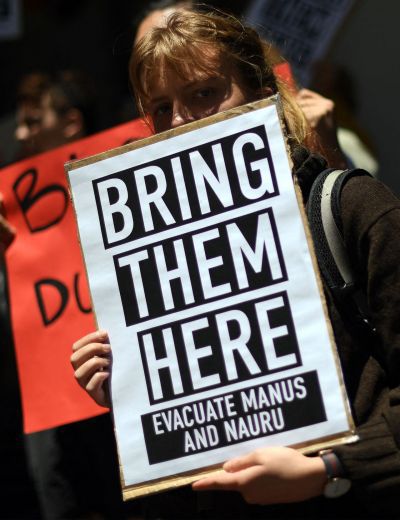 나우루와 파푸아뉴기니 난민수용시설에 반대하는 시위가 2017년 호주 시드니에서 열리고 있다. [이미지출처=AFP연합뉴스] |