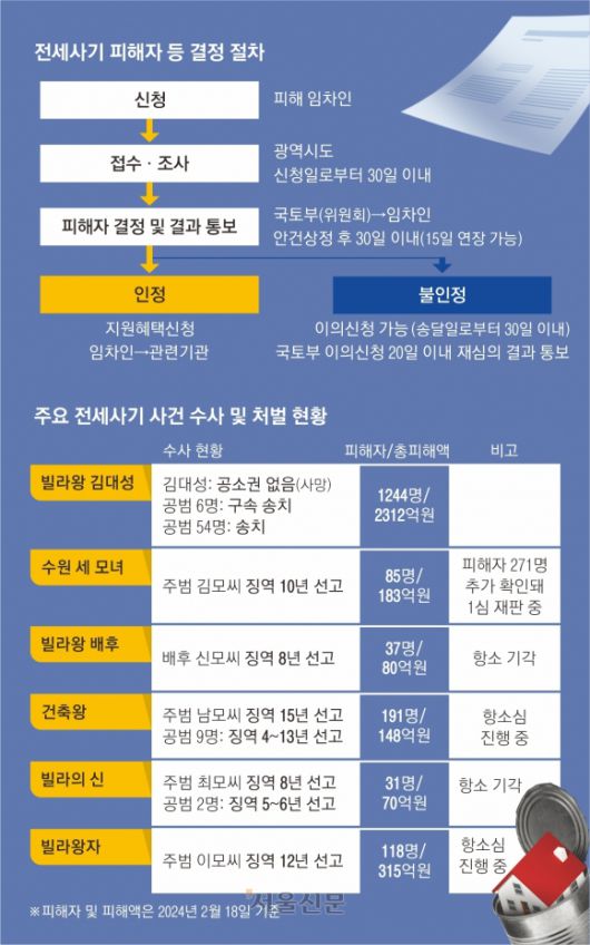 18일 국토교통부에 따르면 남씨를 비롯한 전세사기 ‘왕’과 ‘왕자’들에게 삶의 희망까지 차압당한 1만 3384건 중 정부로부터 피해자로 인정받지 못한 사례는 2440명(18.2%)에 이른다. 집주인이 보증금을 떼먹을 의도가 없었다거나, 이를 속일 의도를 입증하지 못했거나, 다수 피해가 발생하지 않았다는 이유가 대부분이다. 전세 제도의 허점을 악용해 공동체 신뢰를 허문 악랄한 범죄이자 사회적 재난임에도 국가가 책임질 순 없으니, 불운을 탓하라는 식이다. 서울신문이 만난 서울 은평구 김모(34)씨와 경기 오산시 송모(32)씨, 서울 구로구 황정연(45)씨 등은 전 재산이나 다름없는 보증금을 되돌려받기 위한 법정 싸움과 국가로부터 전세사기 피해자로 인정받기 위한 전쟁을 동시에 치르고 있었다.