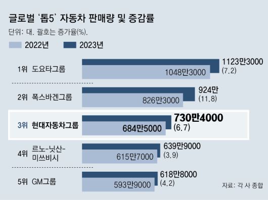 현대자동차그룹이 2022년에 이어 지난해에도 글로벌 자동차 판매량 순위에서 3위를 차지했다. 특히 이 기간 현대차그룹은 4위와의 판매량 격차를 약 69만 대에서 91만 대 수준으로 벌리면서 일본 도요타그룹, 독일 폭스바겐그룹과 함께 자동차 ‘빅3’ 체제를 공고히 했다.