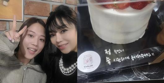 사진 속 케이크 받침에는 “정숙 언니. 숙시원하게 용서해 주세요”라며 ‘정숙’ 이름으로 이행시가 적혀 있어 눈길을 끈다.