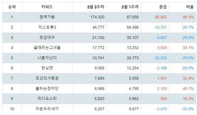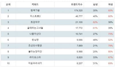 트렌드지수 1위인 현역가왕의 빅데이터 조사한 결과, 현역가왕 투표, 현역가왕 마스크걸 정체, 현역가왕 린 등이 주목받는 관련 검색어로 나타났고, 2위 미스트롯3는 미스트롯3 참가자, 미스트롯3 마스터, 미스트롯3 투표하기, 3위 최강야구는 최강야구 시즌3, 최강야구 직관, 최강야구 갤러리, 최강야구 시즌2, 최강야구 폐지 등으로 나타났다