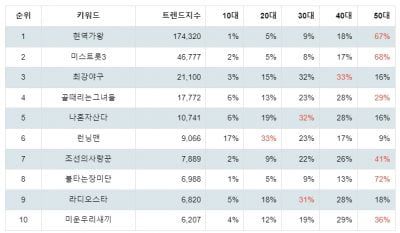 연령별 선호도에서는 현역가왕 10대 1%, 20대 5%, 30대 9%, 40대 18%, 50대 67%로 나타났다.