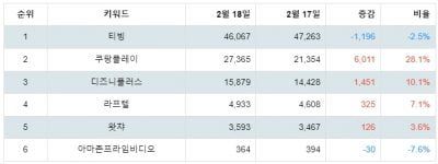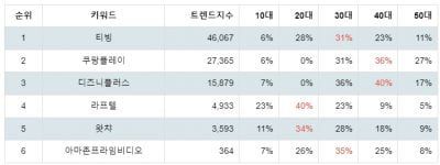 트렌드지수 1위 티빙의 빅데이터 조사한 결과, 티빙 요금제, 티빙 한달무료, 티빙 웨이브, 티빙 드라마, 티빙 추천 등이 주목받는 관련 검색어로 나타났으며 2위 쿠팡플레이는 쿠팡플레이 tv연결, 쿠팡플레이 가격, 쿠팡플레이 추천, 쿠팡플레이 드라마, 쿠팡플레이 해지, 3위 디즈니플러스는 디즈니플러스 추천, 디즈니플러스 해지, 디즈니플러스 무료, 디즈니플러스 가격, 디즈니플러스 성인인증 등으로 나타났다.