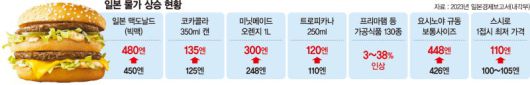 일본 맥도날드는 지난달 24일부터 메뉴 전체의 약 30%에 상당하는 제품 가격을 10~30엔 인상했다. 전국의 약 3000개 전 지점에서 시행, 인기 버거인 빅맥은 450엔에서 480엔으로 가격이 올랐다. 일본 맥도날드가 전국 점포에서 일제히 가격을 인상한 것은 2022년 이후 4번째다.