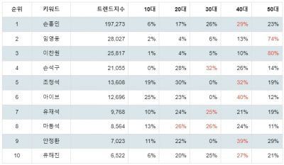트렌드지수 1위 손흥민의 빅데이터 조사한 결과, 손흥민 연봉, 손흥민 경기일정, 손흥민 김고은, 손흥민 이적, 손흥민 문가영 등이 주목받는 관련 검색어로 나타났으며 2위 임영웅은 임영웅 콘서트, 임영웅 엄마, 임영웅 콘서트 티켓팅, 임영웅 갤러리, 임영웅 노래, 3위 이찬원은 이찬원 콘서트, 이찬원 갤러리, 이찬원 팬카페, 이찬원공식팬카페, 이찬원갤 등으로 나타났다.