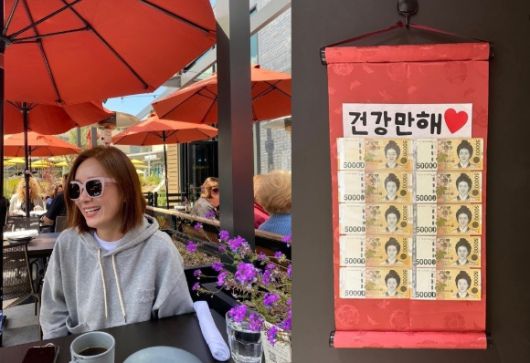 공개된 사진에는 5만원권으로 만들어진 족자의 모습이 담겼다. '건강만해'라는 문구가 다정함을 드러내고 있다.