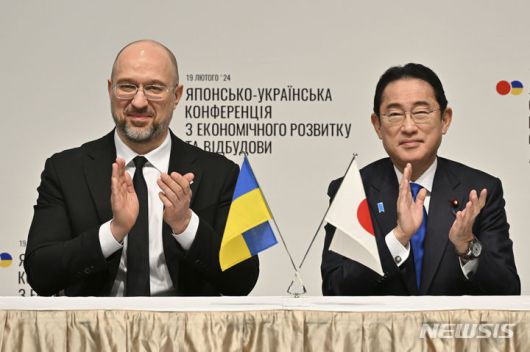 [도쿄=AP/뉴시스] 기시다 후미오(오른쪽) 일본 총리와 데니스 시미할 우크라이나 총리가 19일 도쿄의 게이단렌(일본경제단체인협회) 회관에서 열린 일-우크라이나 경제회복 추진회의에 참석해 농업, 에너지 기반 시설 등의 분야에서 일본과 우크라이나 기업이 계약을 체결하는 것을 보면서 박수하고 있다. 두 정상은 우크라이나 경제 안정을 위한 장기적 지원 제공에 관한 공동성명을 발표했다. 2024.02.19. |