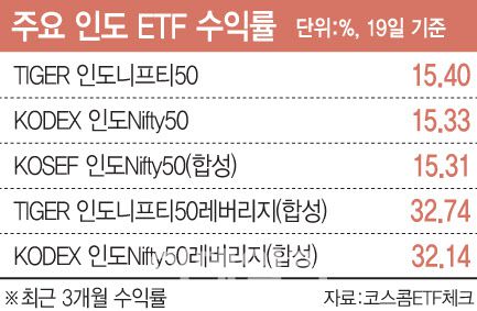 19일 코스콤 ETF체크에 따르면 인도증권거래소에서 주요 종목 50개로 구성된 ‘니프티(Nifty)50 지수’를 추종하는 국내 ETF의 최근 3개월 수익률은 평균 15%다. 삼성자산운용의 ‘KODEX 인도Nifty50’과 미래에셋자산운용의 ‘TIGER 인도니프티 50’, 키움투자자산운용의 ‘KOSEF 인도Nifty50(합성)’이 각 15% 수준의 상승률을 보였다. 일간 수익률 2배를 추종하는 ‘TIGER 인도니프티50레버리지(합성)’과 ‘KODEX 인도 Nifty50레버리지(합성)’는 각 32% 수준의 오름세를 나타냈다.