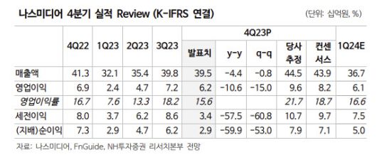 [이데일리 김보겸 기자] NH투자증권은 20일 나스미디어(089600)에 대해 넷플릭스나 티빙 등 OTT 광고대행 본격화 및 인공지능(AI) 기술 활용을 통한 매출 성장 여력이 높다고 평가했다. 신사업 관련 비용 증가세가 예상보다 가파른 점은 아쉽다는 분석이다. 투자의견 ‘매수’를 유지하고 목표가는 3만2000원으로 상향했다. 19일 종가는 2만3600원이다.