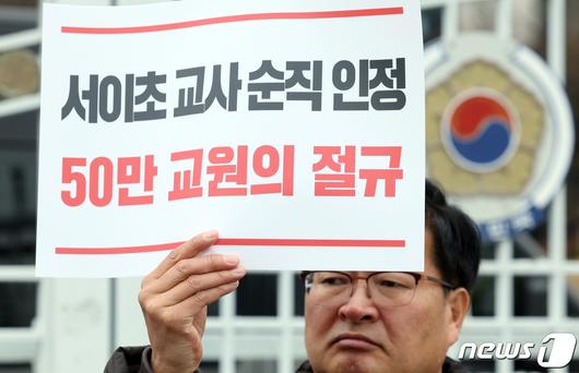 (서울=뉴스1) 박정호 기자 = 한국교총과 교사노동조합연맹, 전국교직원노동조합 등 교원단체·교원노조 관계자들이 20일 오전 서울 종로구 세종대로 정부서울청사 앞에서 고 서이초 교사 순직 인정 및 순직 인정 제도 개선 촉구 기자회견 하고 있다. 교원단체와 교원노조는 오는 21일 순직 인정여부가 결정되는 인사혁신처의 공무원재해보상심의회 개최를 앞두고 가진 이날 기자회견에서 유가족의 순직 인정 신청을 위한 조력 시스템 구축과 공무원재해보상심의회 교원 참여 보장 등을 강력하게 요구했다. 2024.2.20/뉴스1